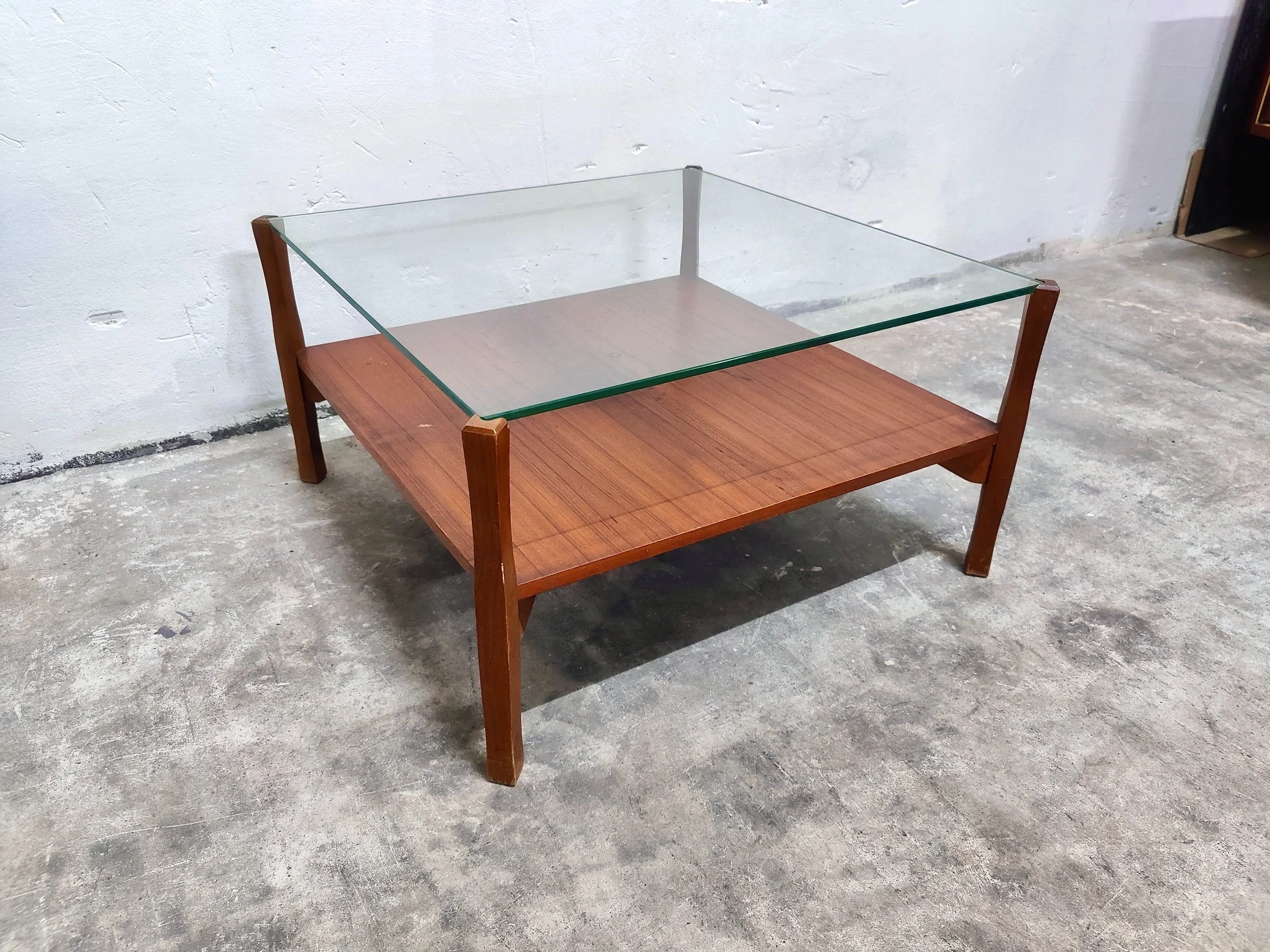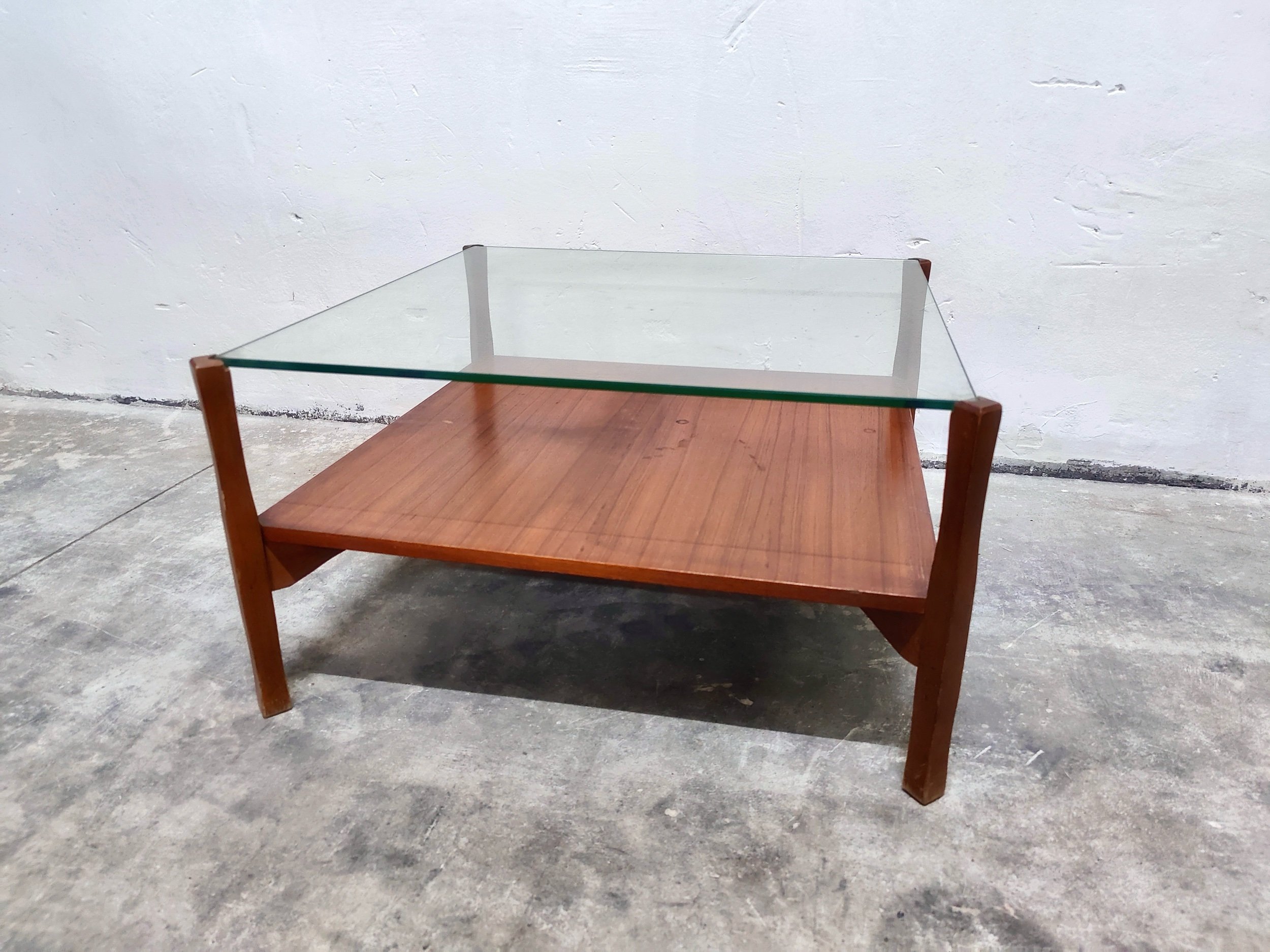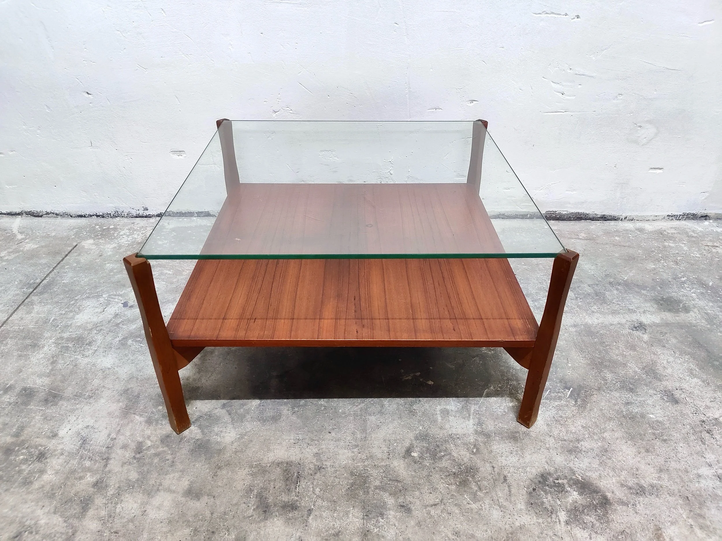 Il design funzionale offre due ampie superfici: un ripiano superiore in vetro e un ripiano inferiore in legno massiccio, ideale per riporre libri o riviste. Un complemento d'arredo versatile e scultoreo che incarna la pulizia formale e la qualità artigianale del design italiano del Mid-Century.
