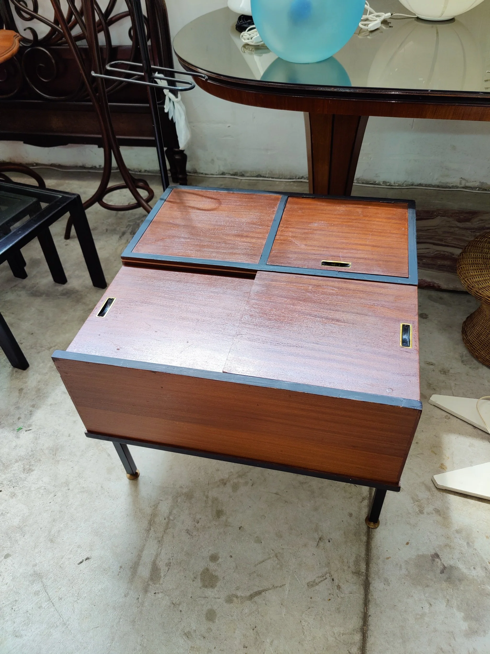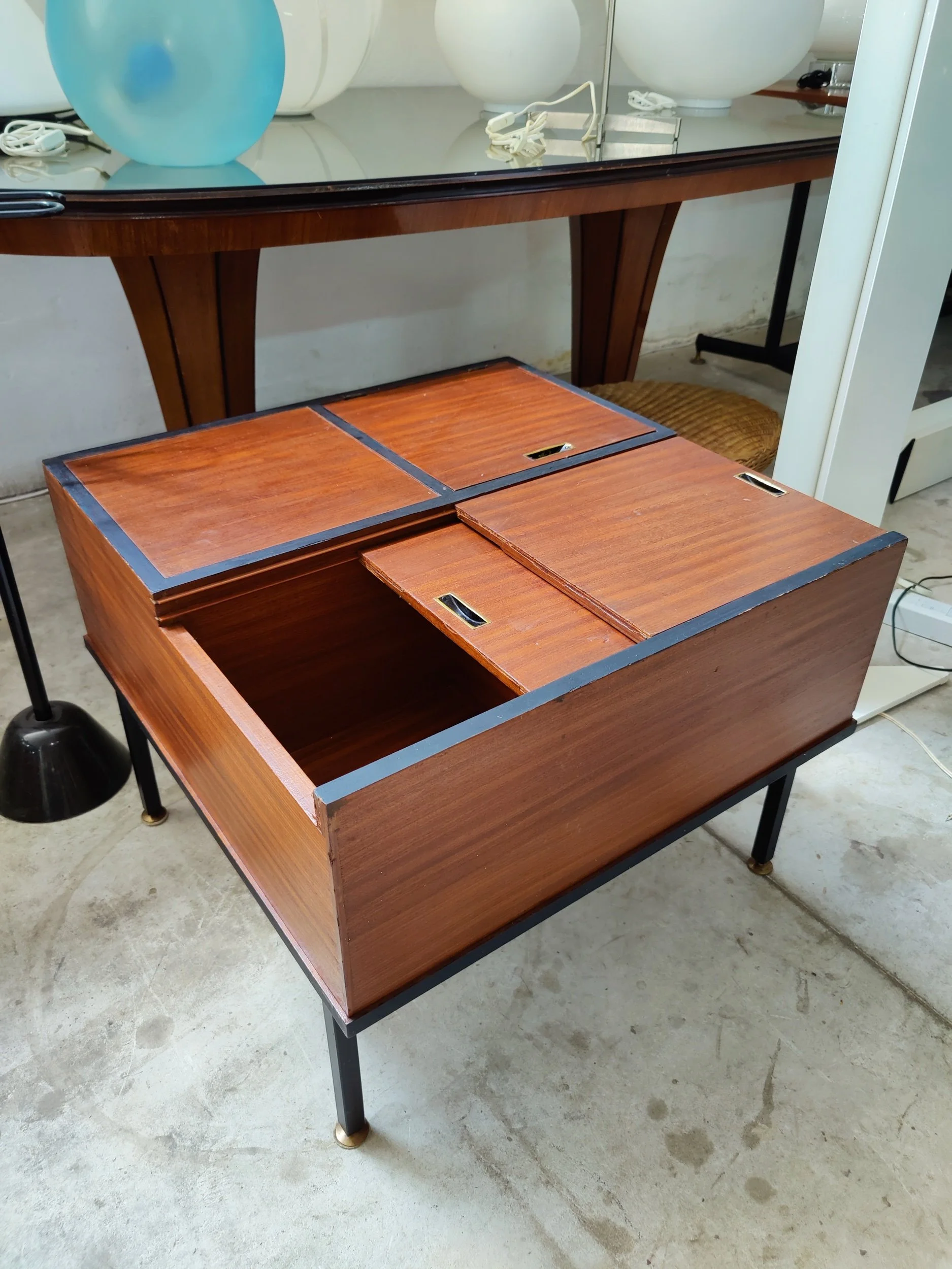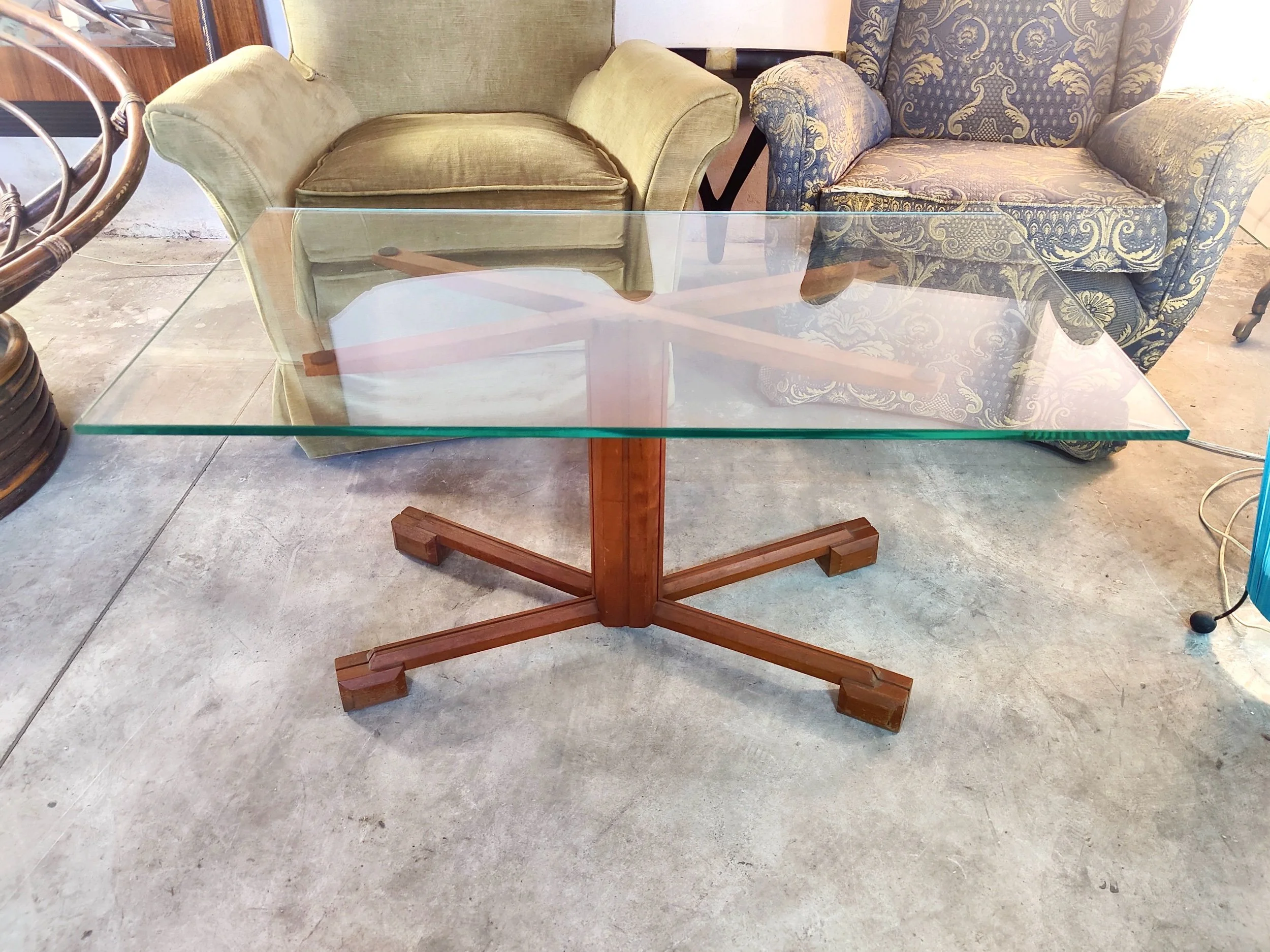 Il design funzionale offre due ampie superfici: un ripiano superiore in vetro e un ripiano inferiore in legno massiccio, ideale per riporre libri o riviste. Un complemento d'arredo versatile e scultoreo che incarna la pulizia formale e la qualità artigianale del design italiano del Mid-Century.