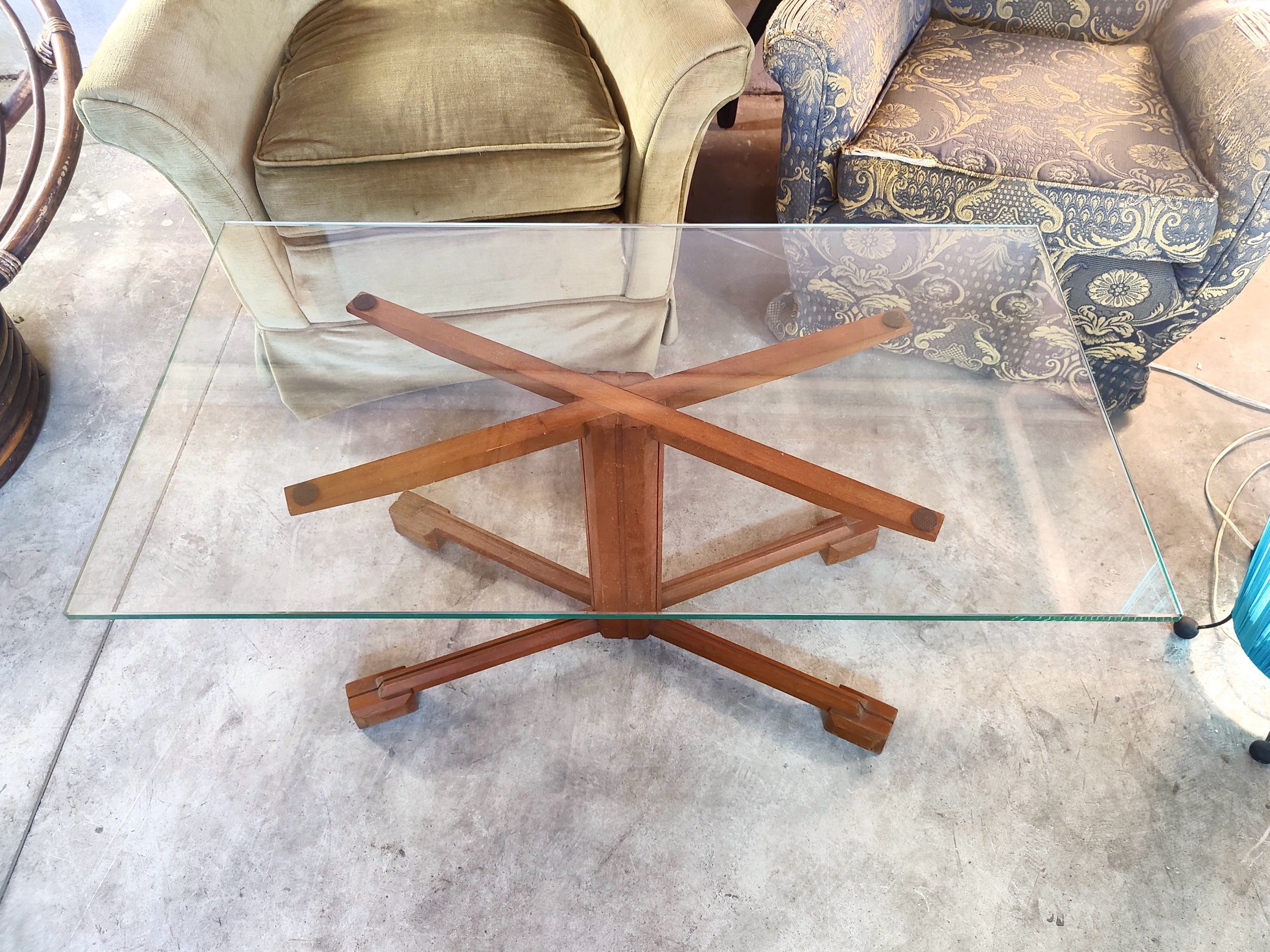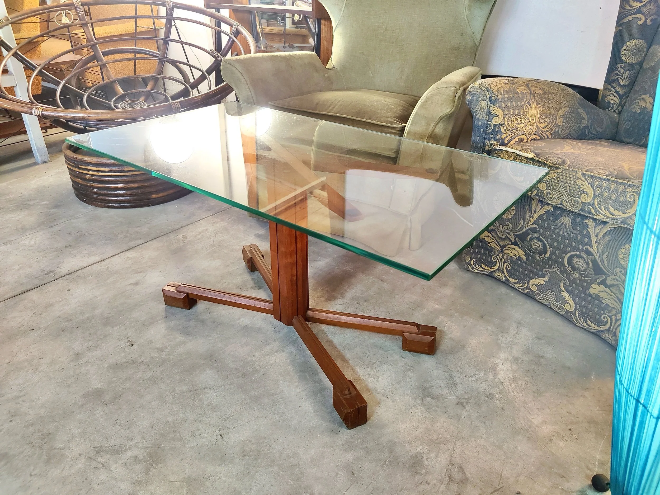Elegante esempio di design modernista, questo tavolino presenta una struttura in legno con una ricca finitura calda e ambrata. La silhouette è caratterizzata da gambe rastremate che salgono per incorniciare il ripiano superiore in cristallo trasparente, creando un effetto a castone.