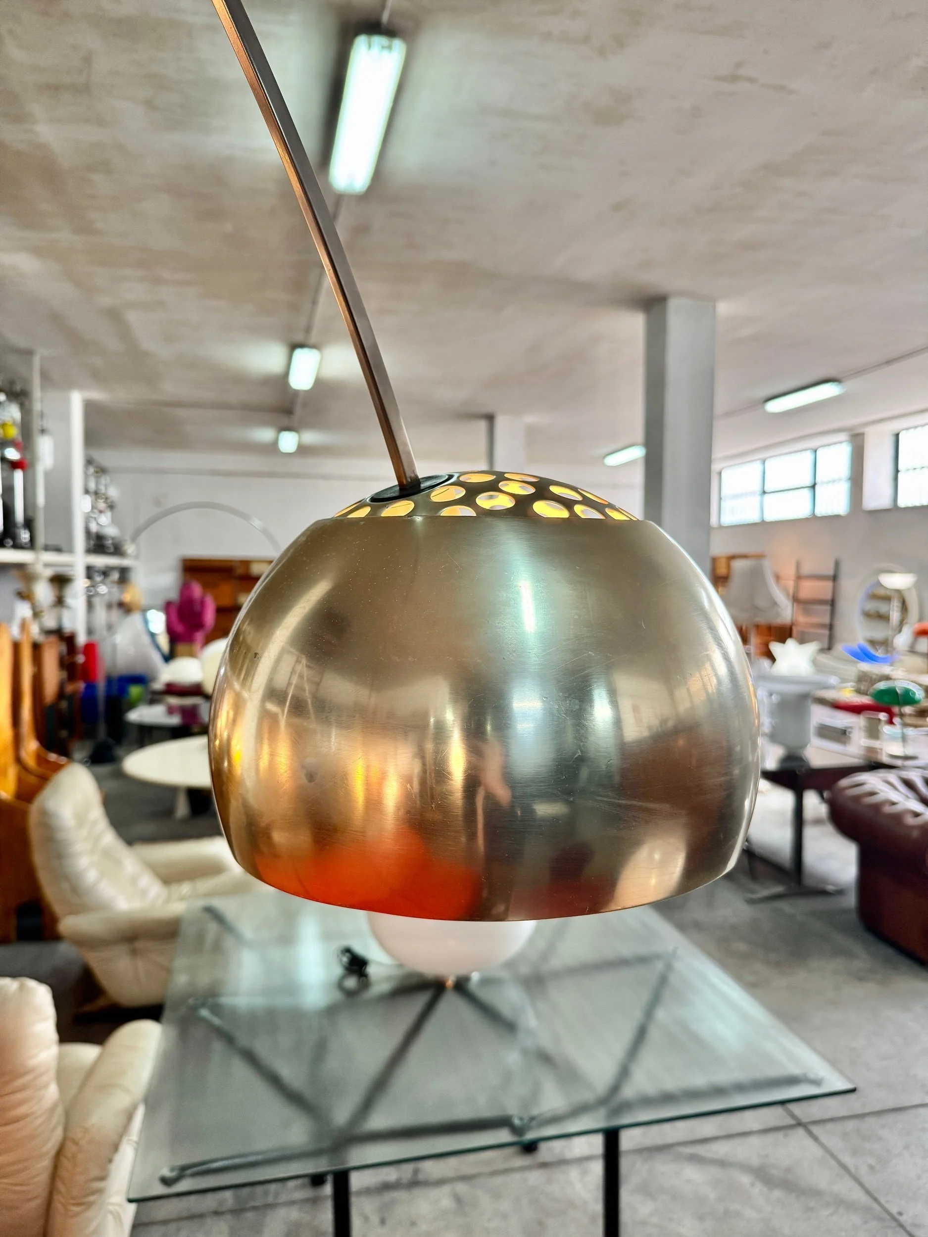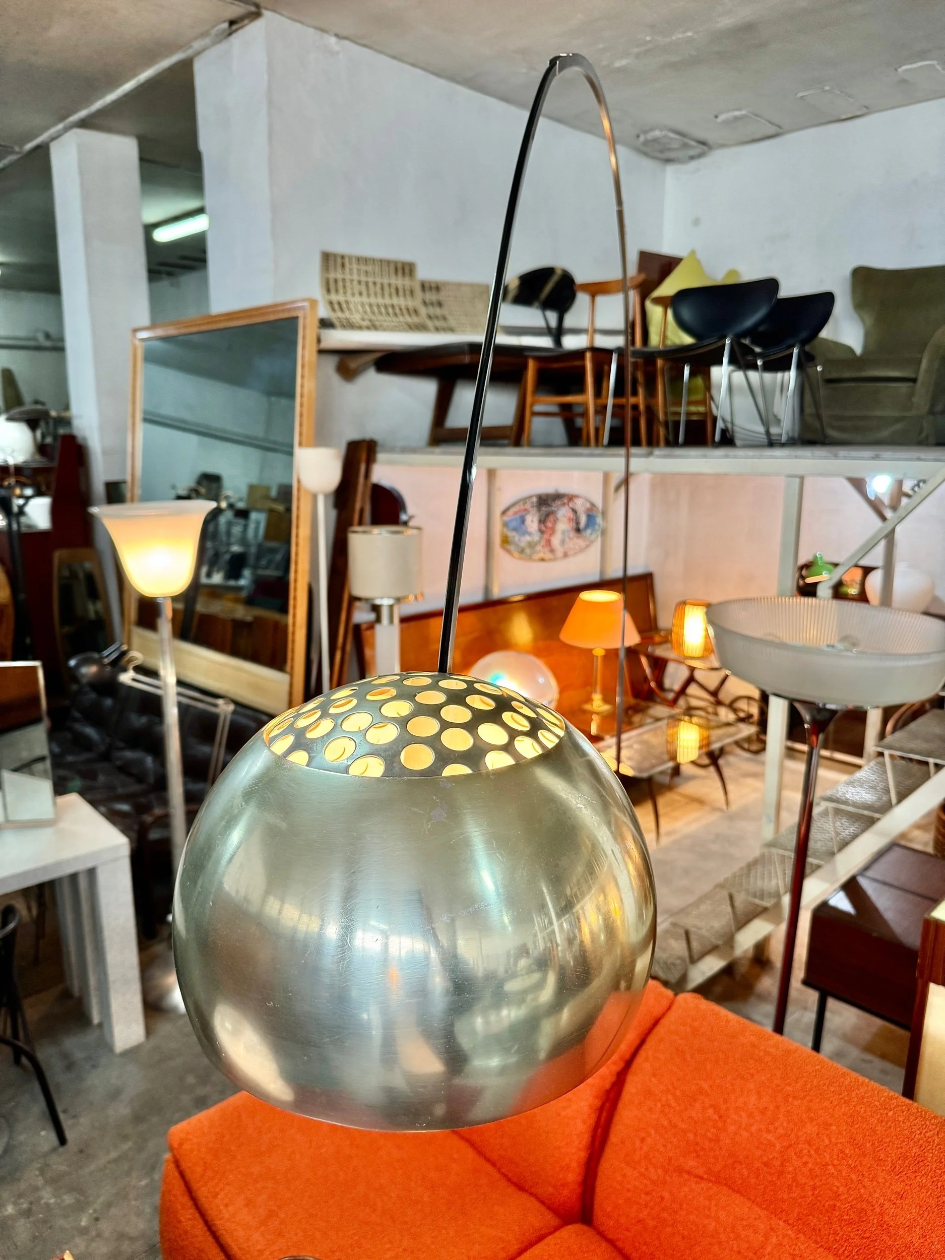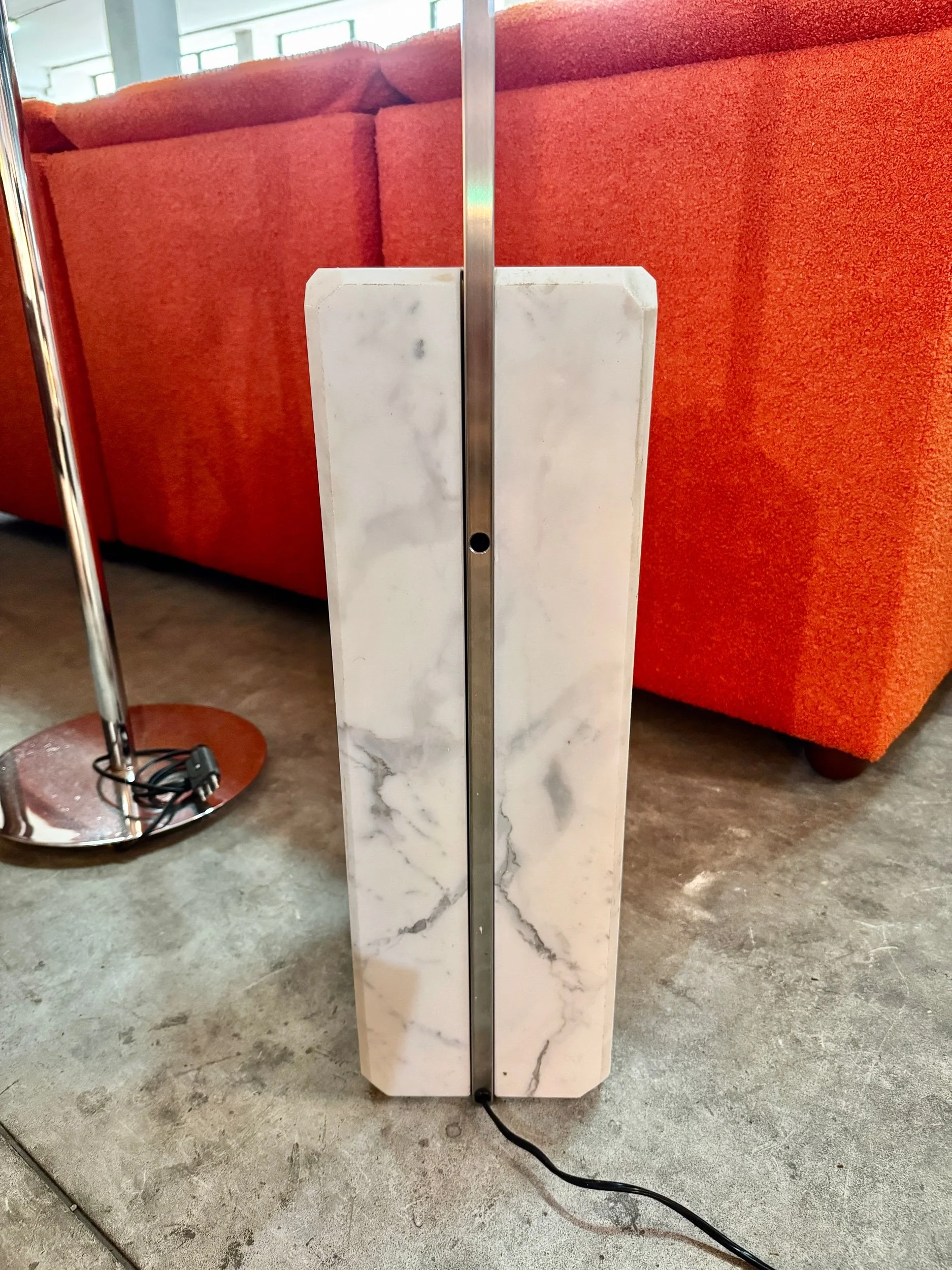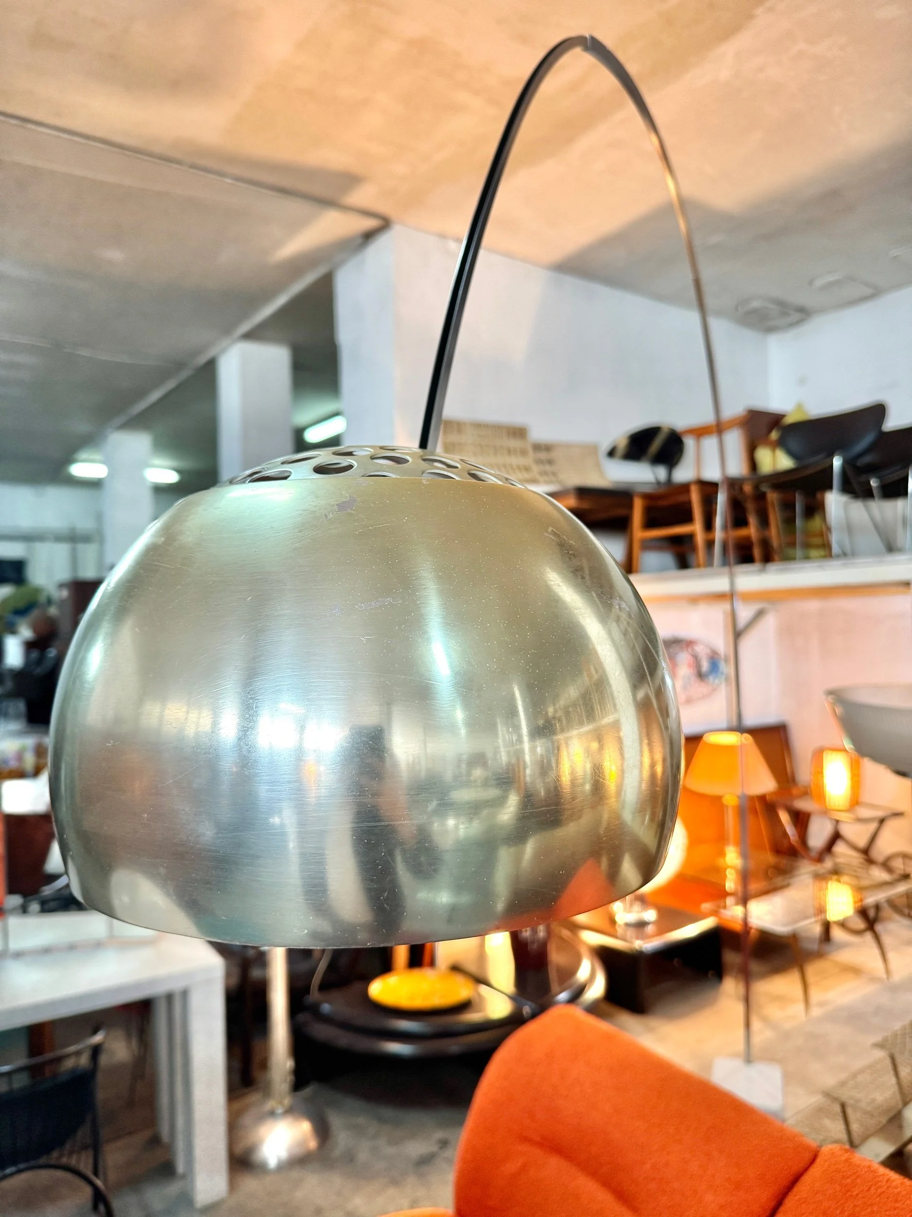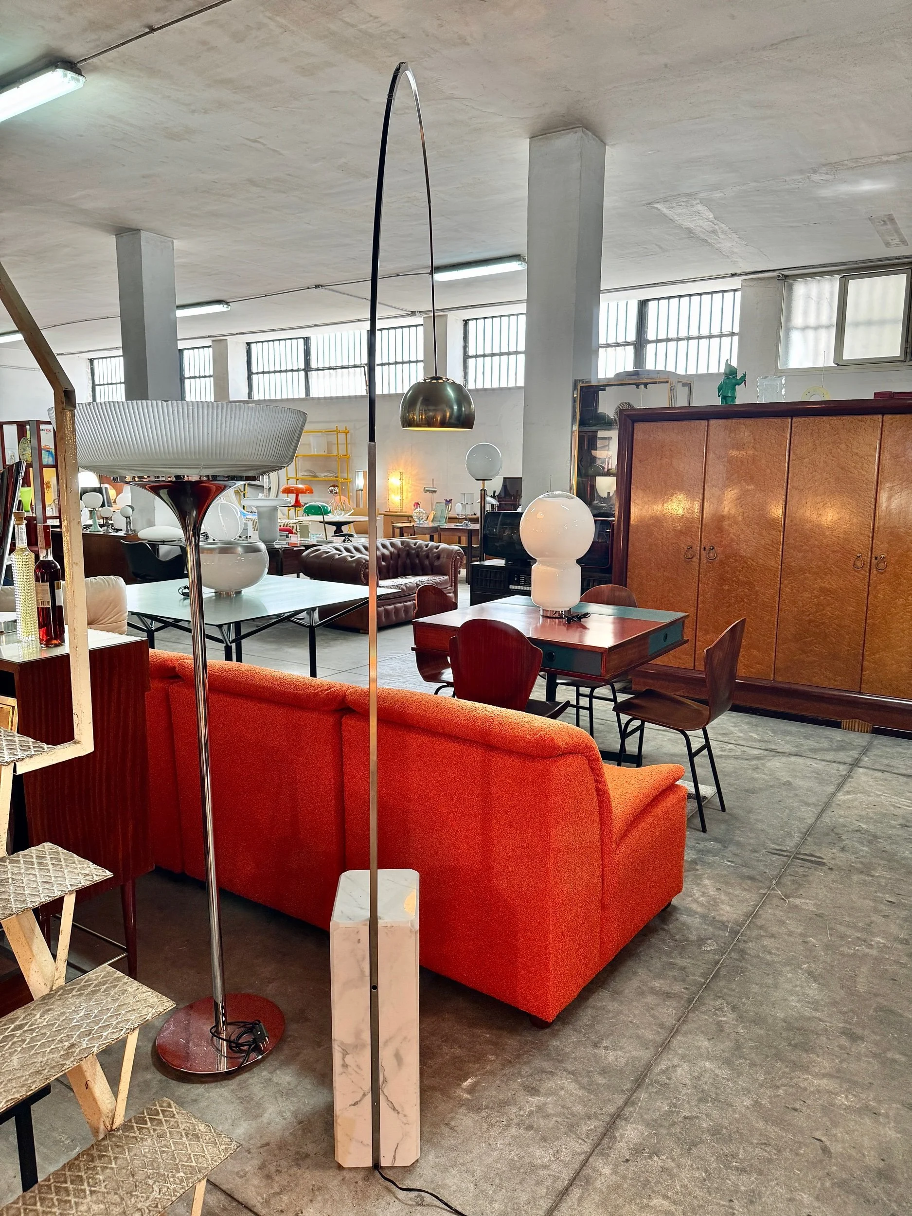 Struttura ad arco in acciaio cromato lucido con base in marmo bianco di Carrara, diffusore a sfera in alluminio spazzolato. Braccio telescopico regolabile in altezza. Design Achille e Pier Giacomo Castiglioni per Flos, 1962 — uno dei pezzi più iconici e riprodotti del design italiano del Novecento.