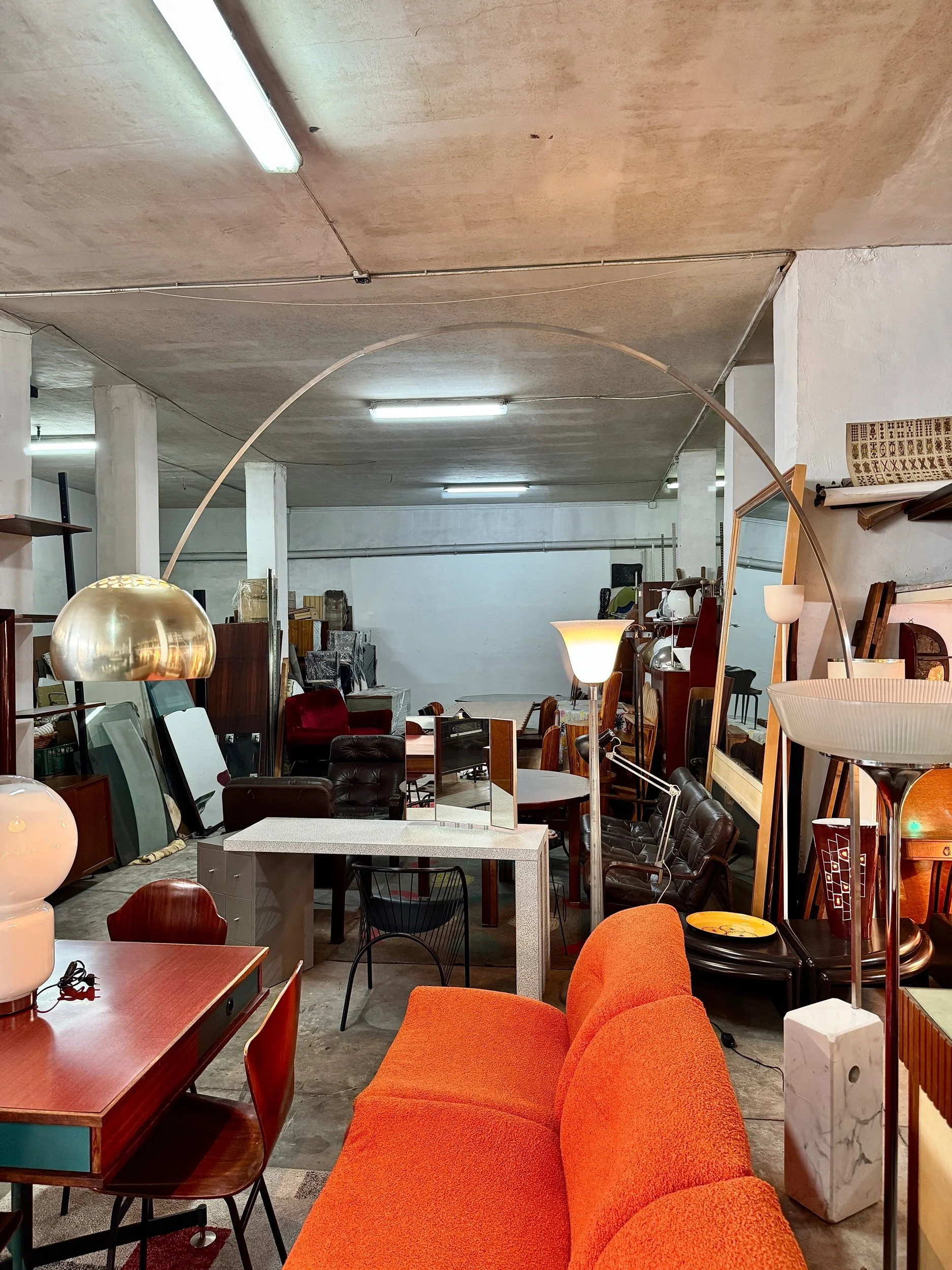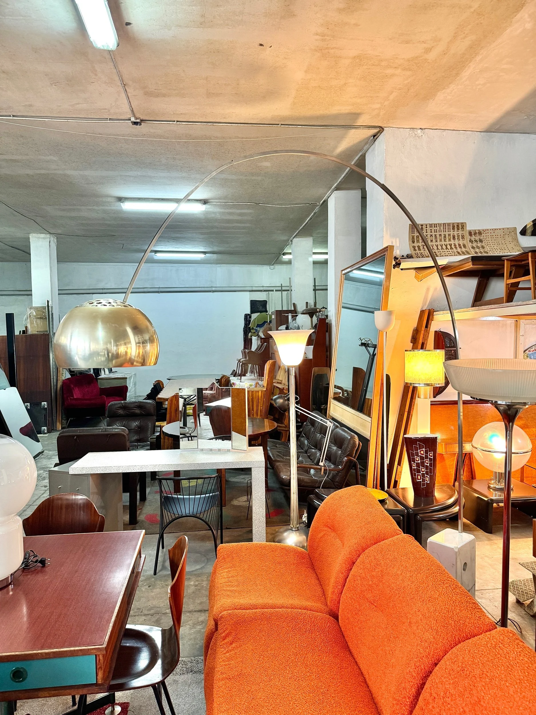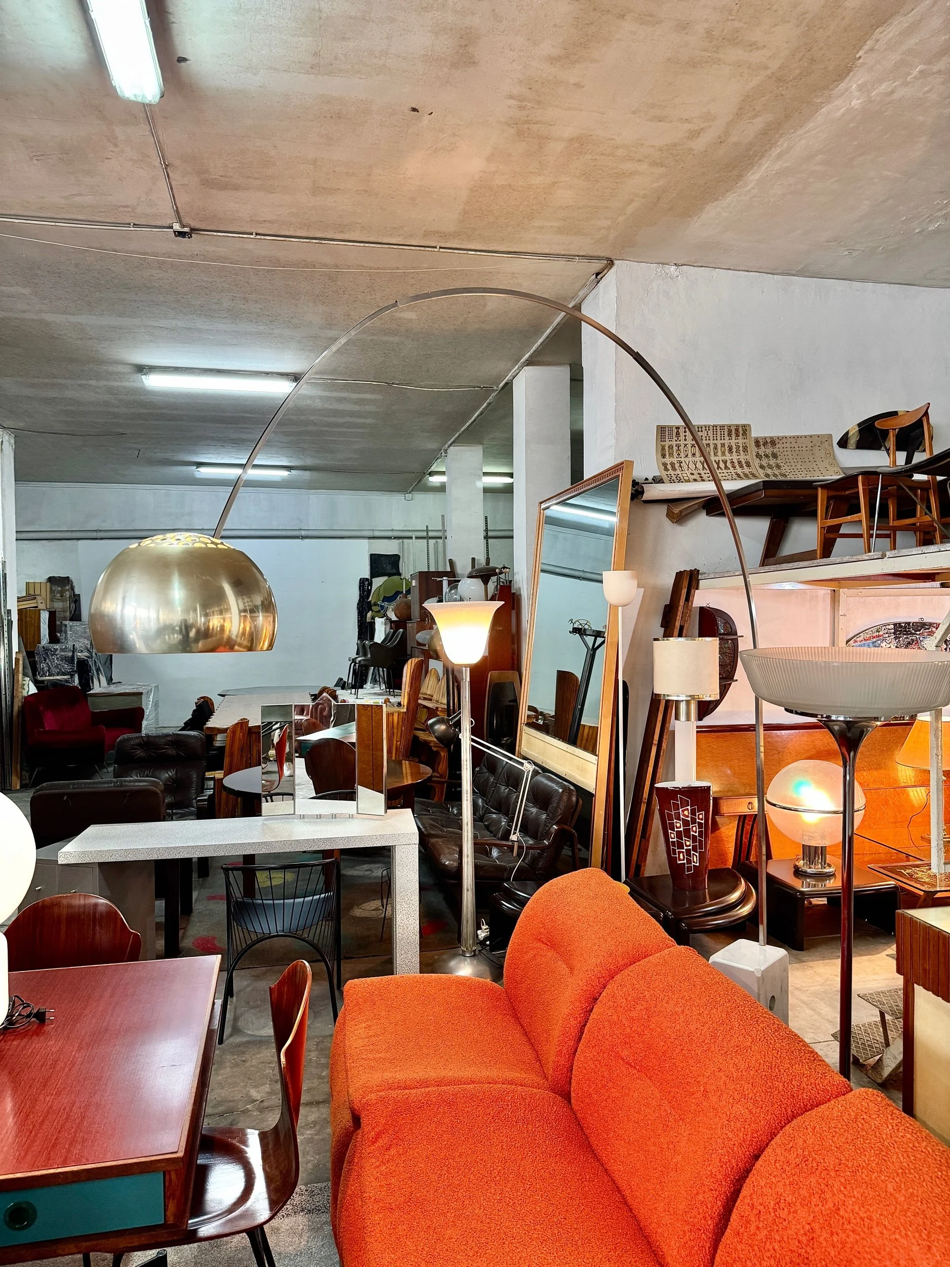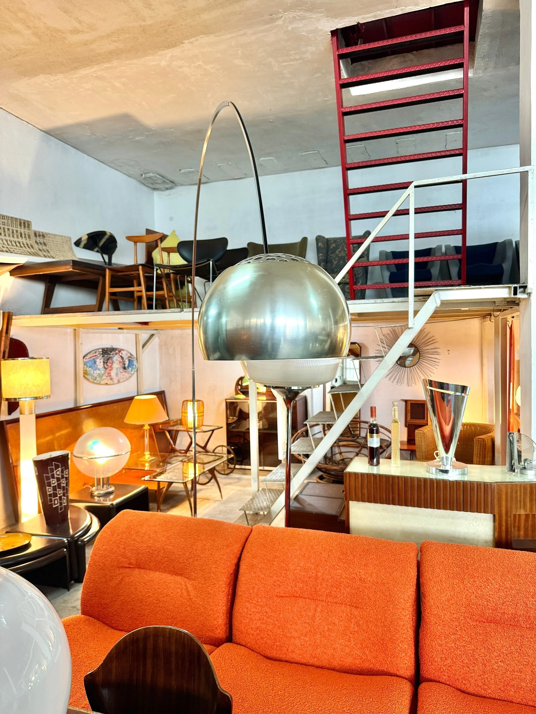 Struttura ad arco in acciaio cromato lucido con base in marmo bianco di Carrara, diffusore a sfera in alluminio spazzolato. Braccio telescopico regolabile in altezza. Design Achille e Pier Giacomo Castiglioni per Flos, 1962 — uno dei pezzi più iconici e riprodotti del design italiano del Novecento.