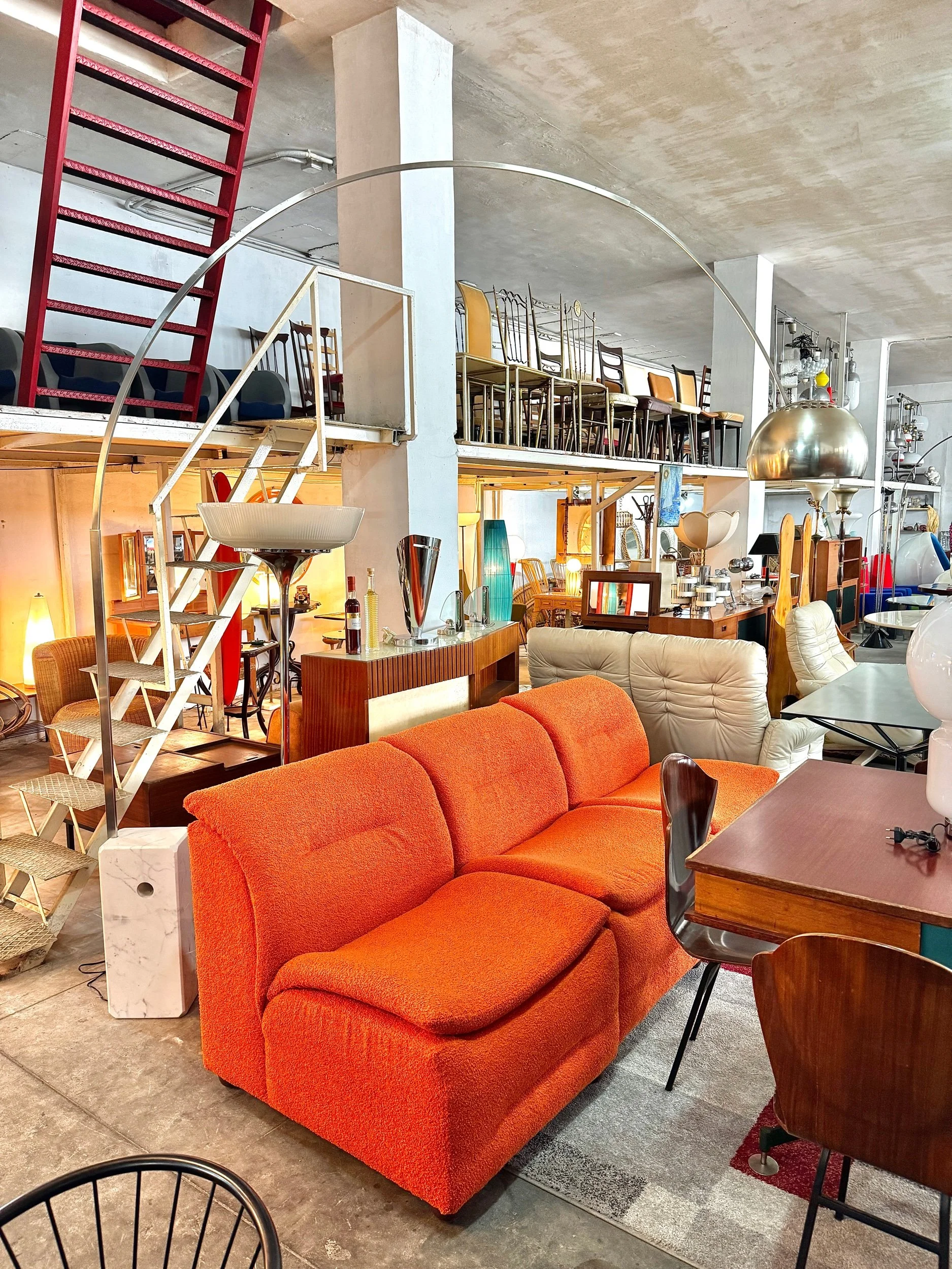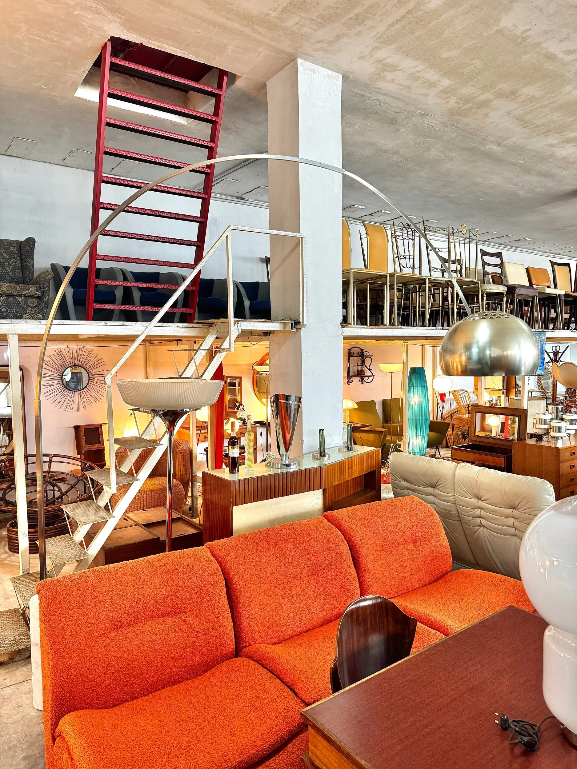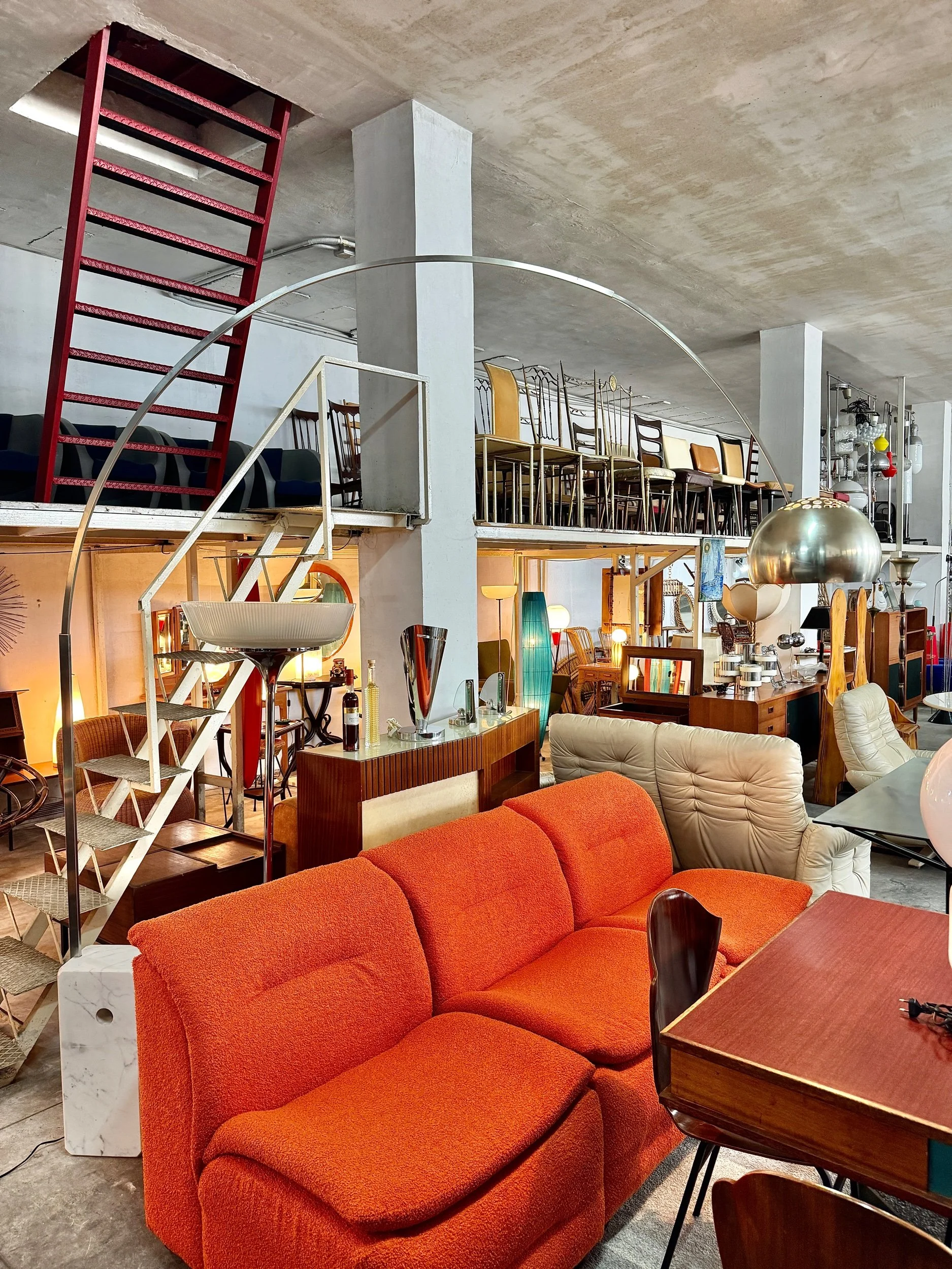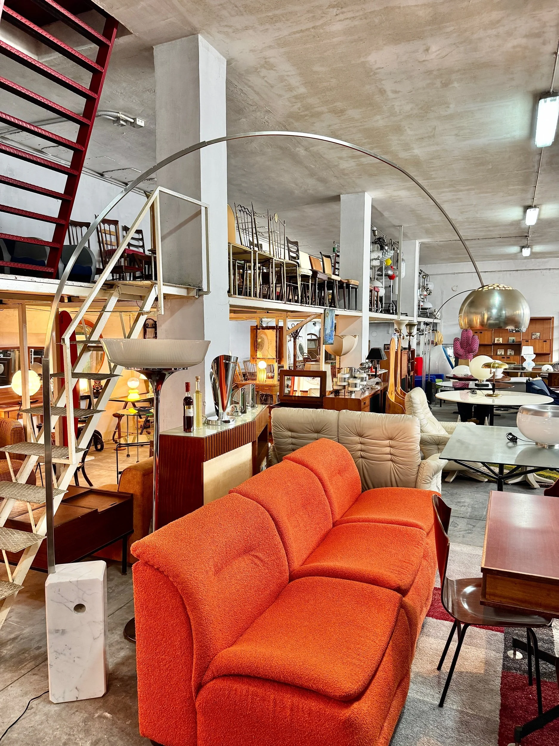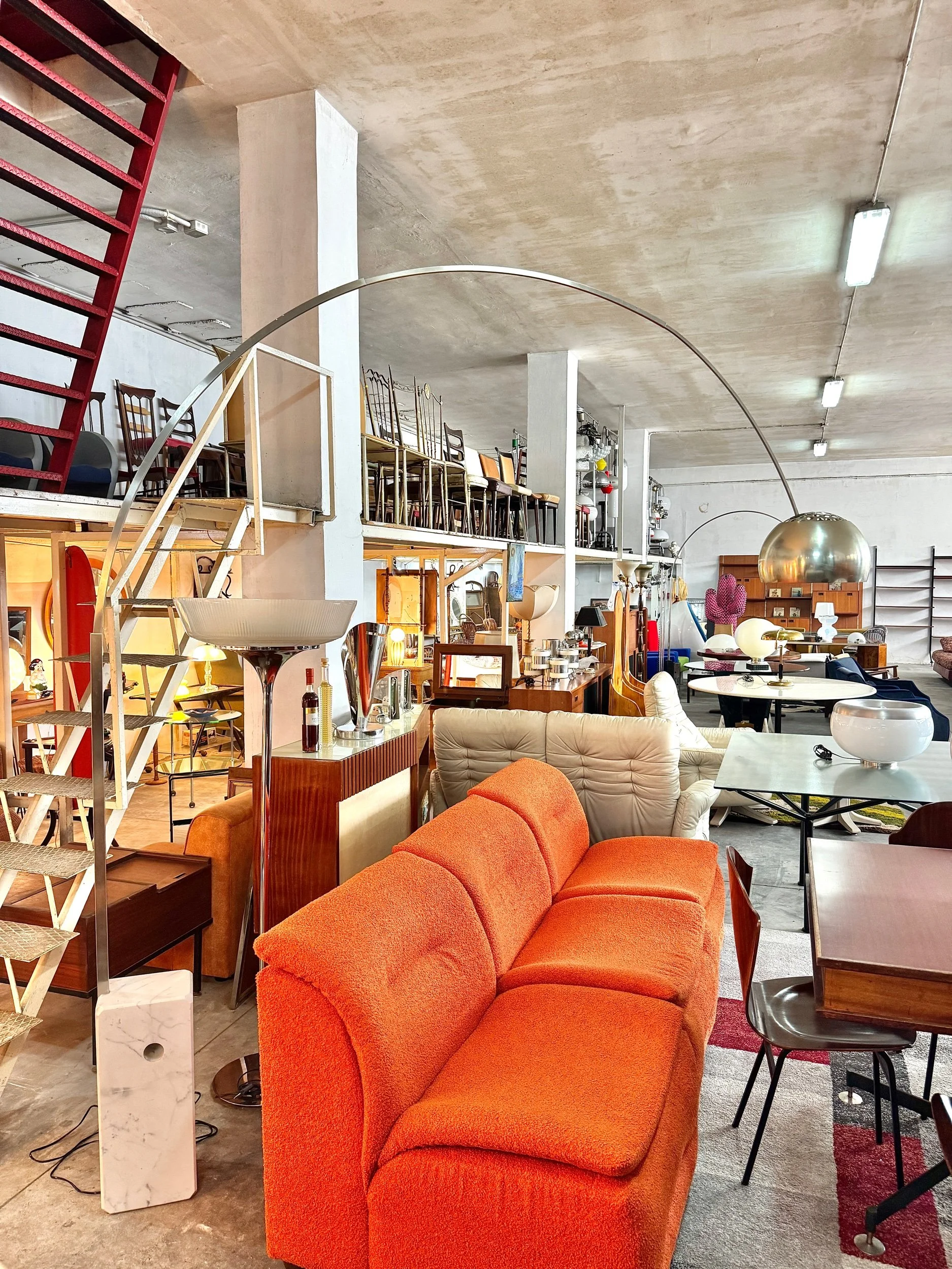 Struttura ad arco in acciaio cromato lucido con base in marmo bianco di Carrara, diffusore a sfera in alluminio spazzolato. Braccio telescopico regolabile in altezza. Design Achille e Pier Giacomo Castiglioni per Flos, 1962 — uno dei pezzi più iconici e riprodotti del design italiano del Novecento.