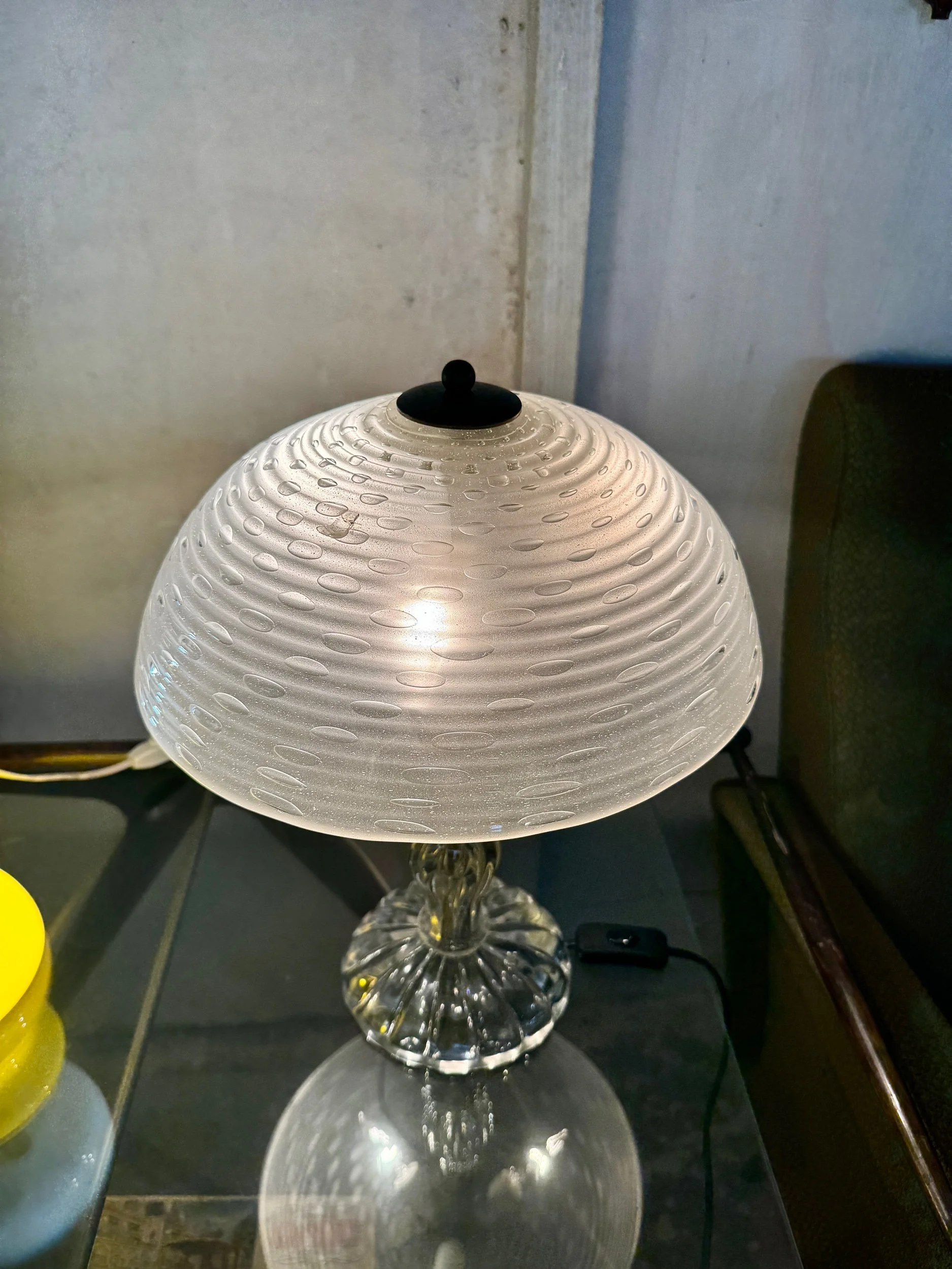 Accesa, diffonde una luce morbida e uniforme che valorizza la texture del vetro. Funziona su un comodino, un console o un tavolo di ingresso. Presenza raffinata senza essere invadente.