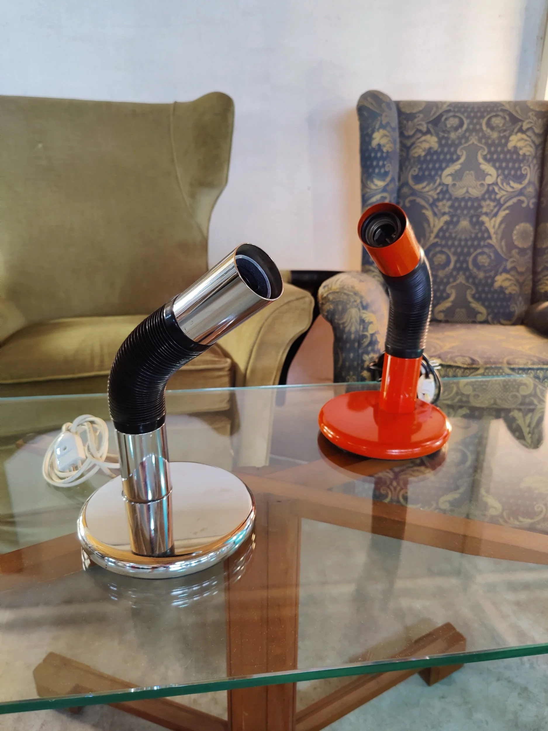 Coppia di lampade da tavolo orientabili con collo flessibile, anni ’70.