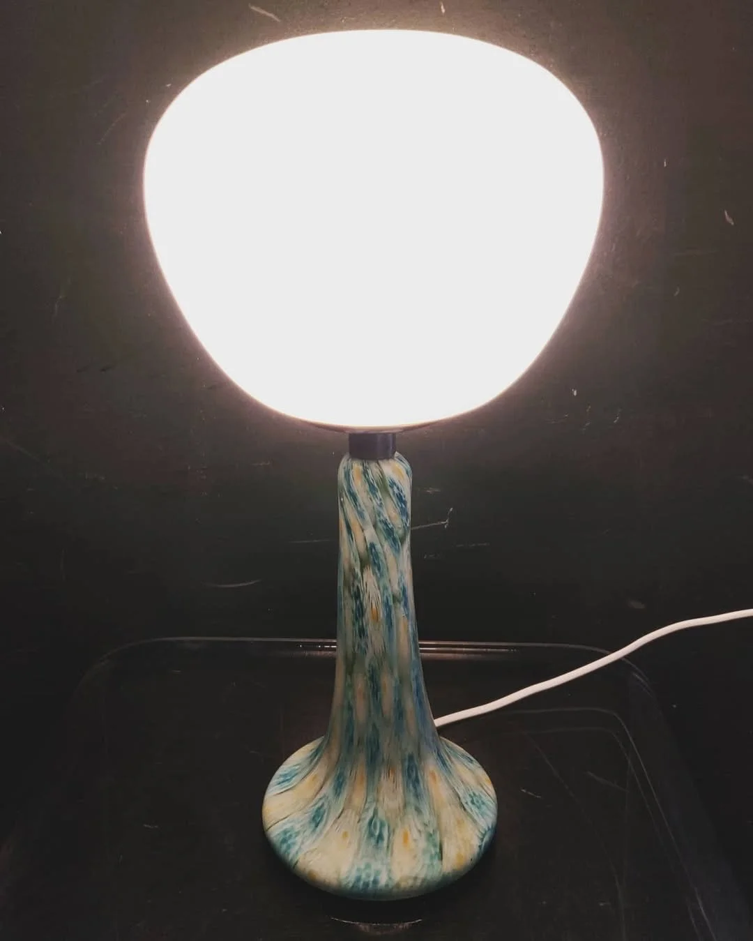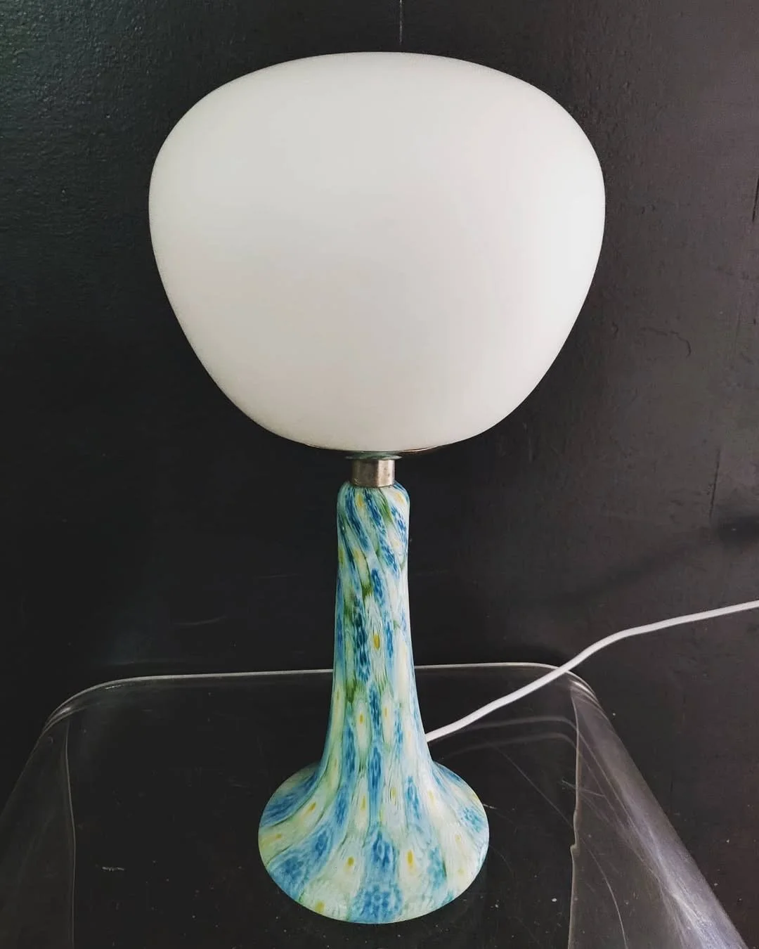 Base a tromba in vetro soffiato con lavorazione a macchie turchesi, verde acqua e giallo ocra distribuiti irregolarmente nella massa vitrea. Raccordo in metallo cromato, diffusore a cupola schiacciata in vetro opalino bianco satinato. Manifattura muranese, ogni esemplare unico per distribuzione cromatica.