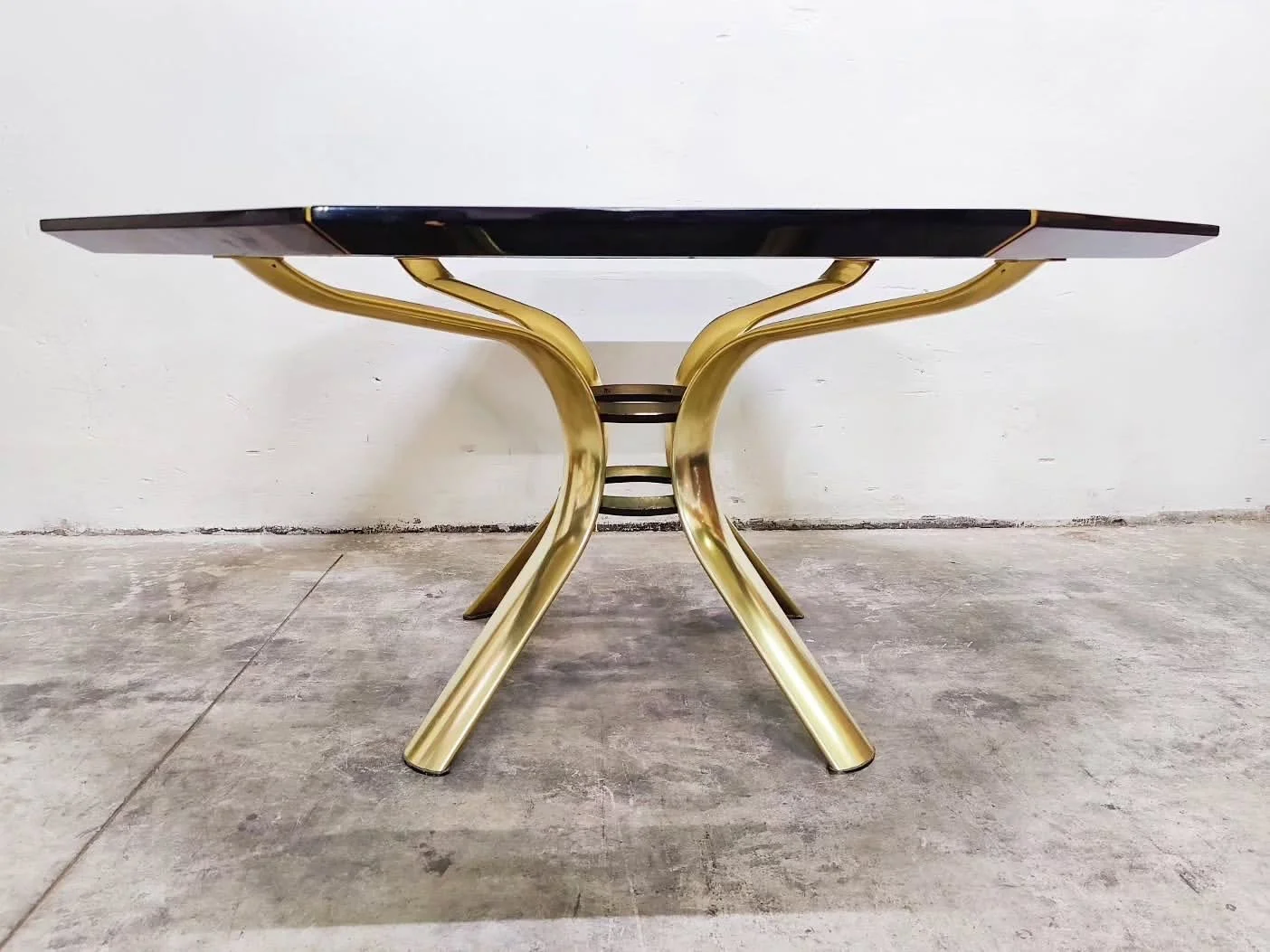 Struttura scultorea in ottone curvato con base a quattro gambe ramificate.