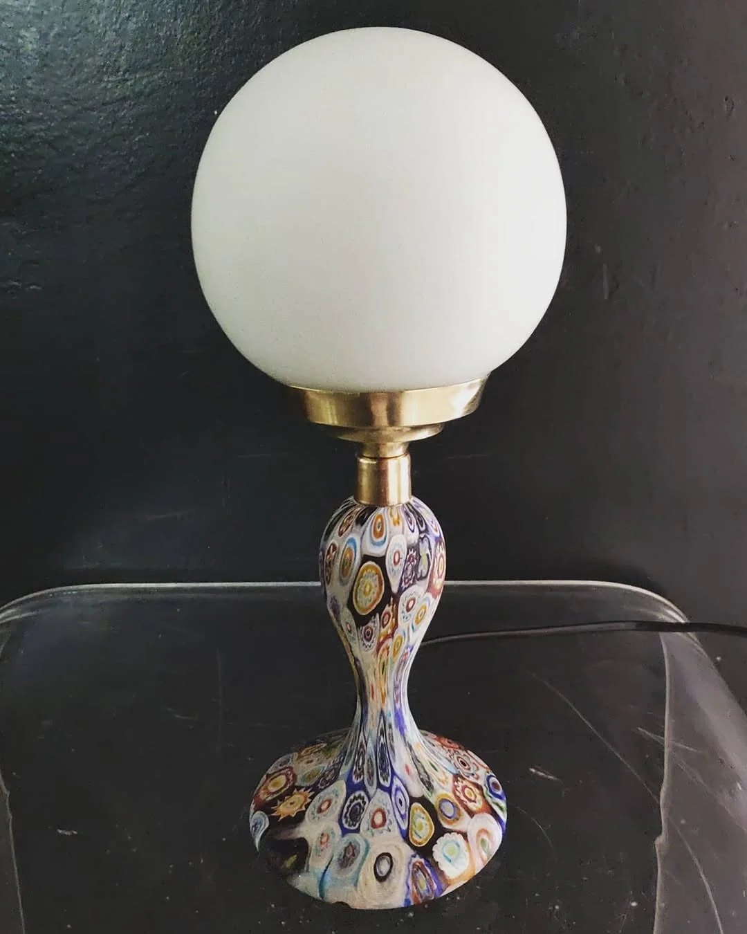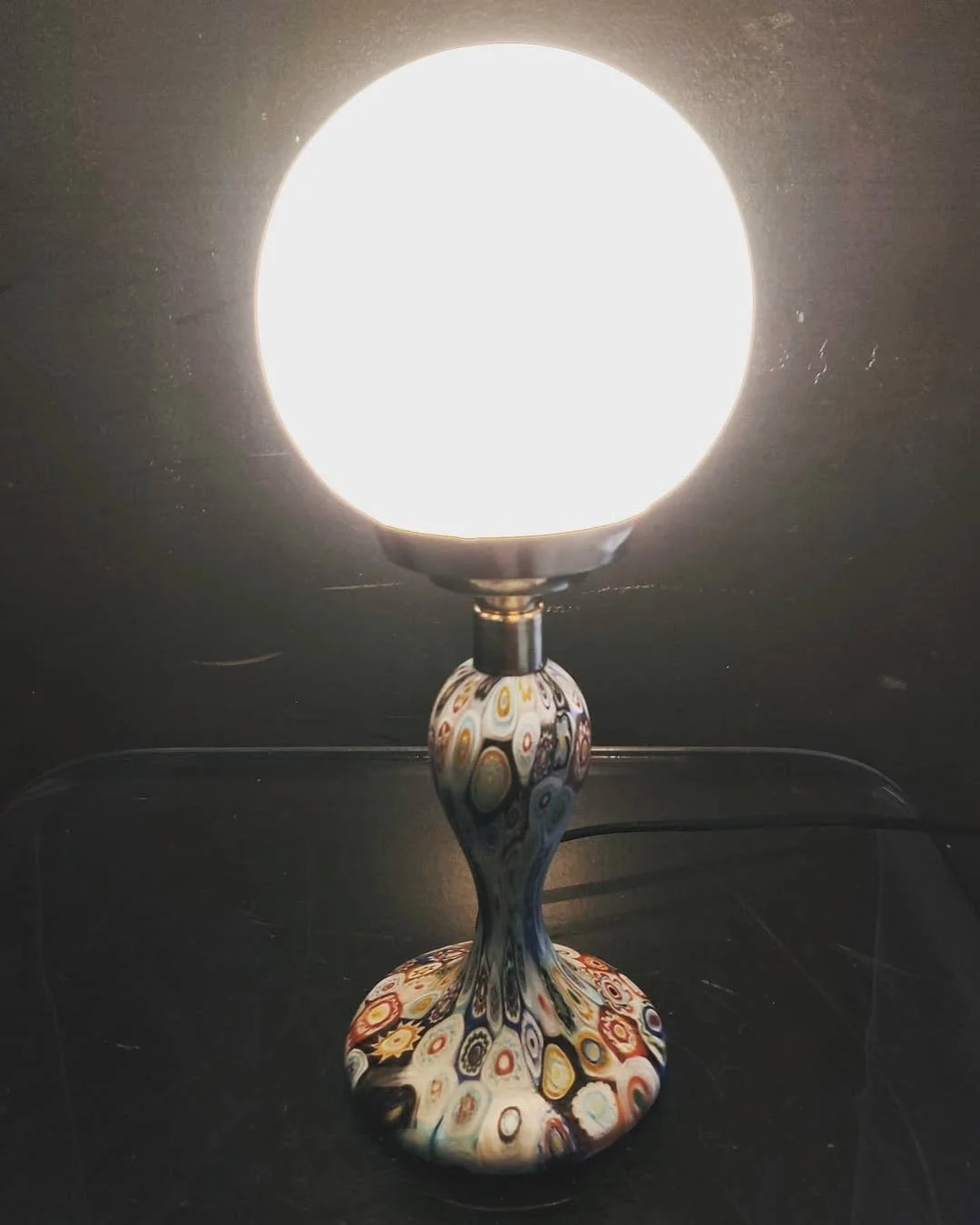 Lampada da tavolo in vetro di Murano a murrine colorate con diffusore a sfera, anni ’30.