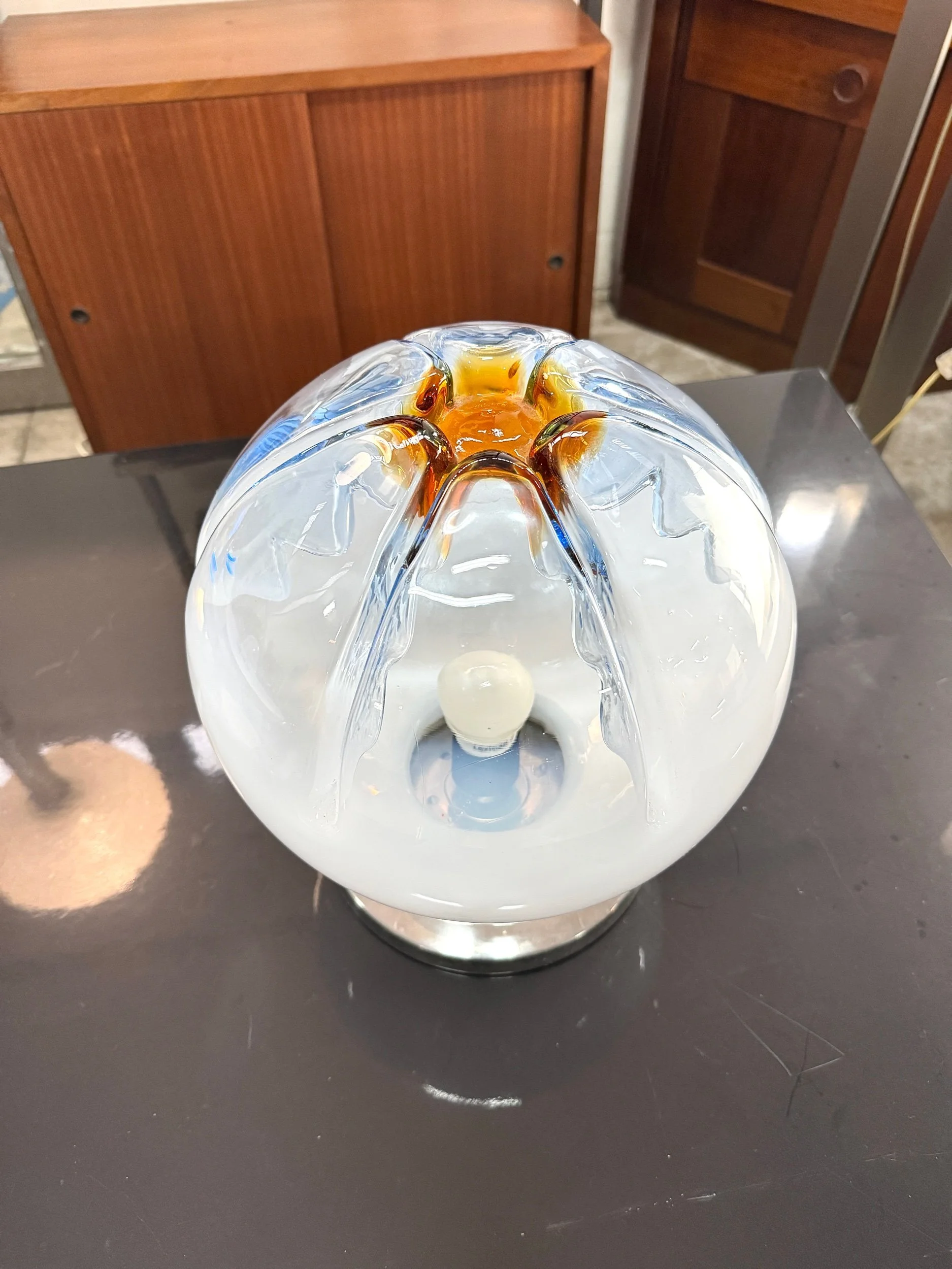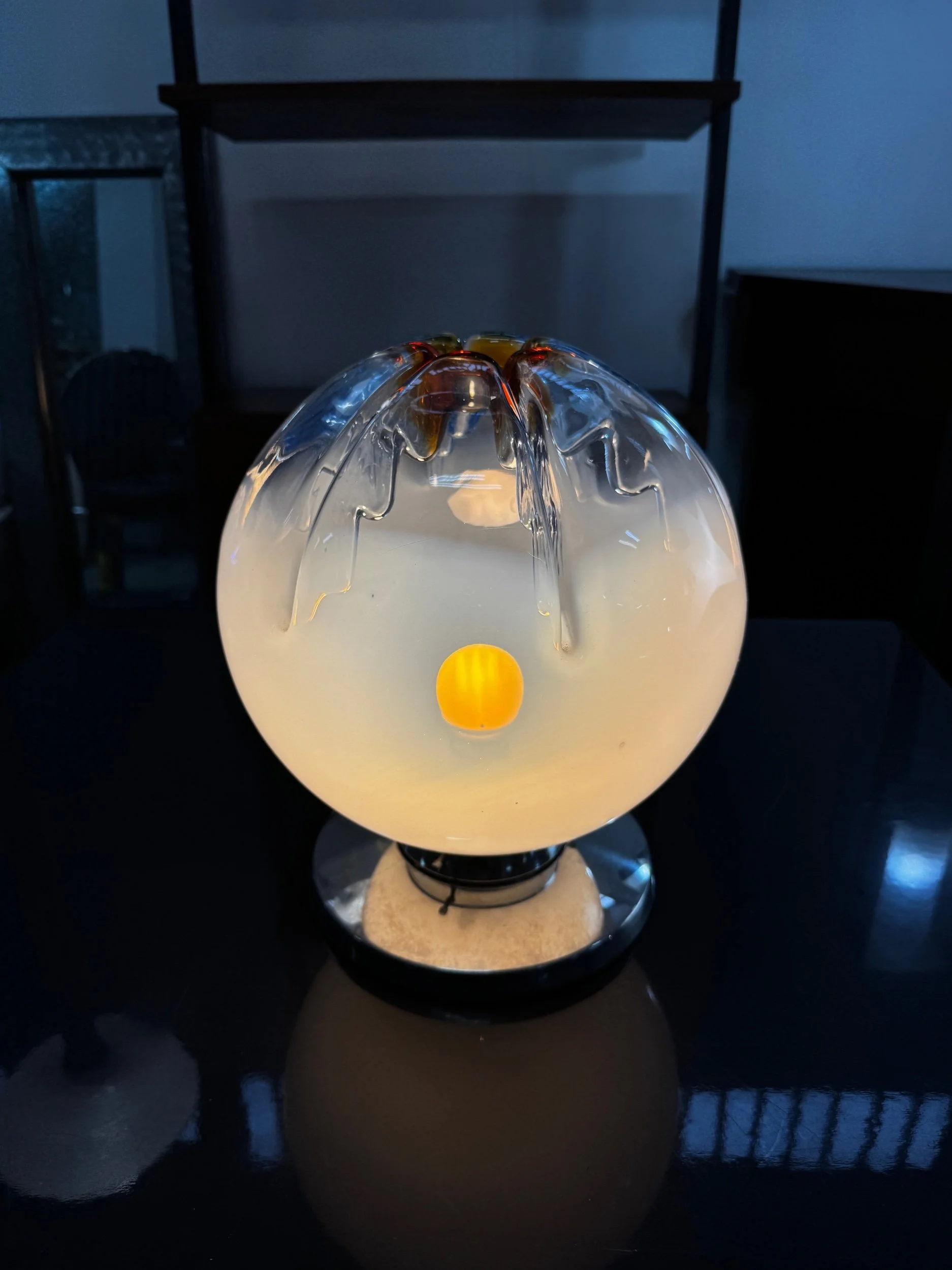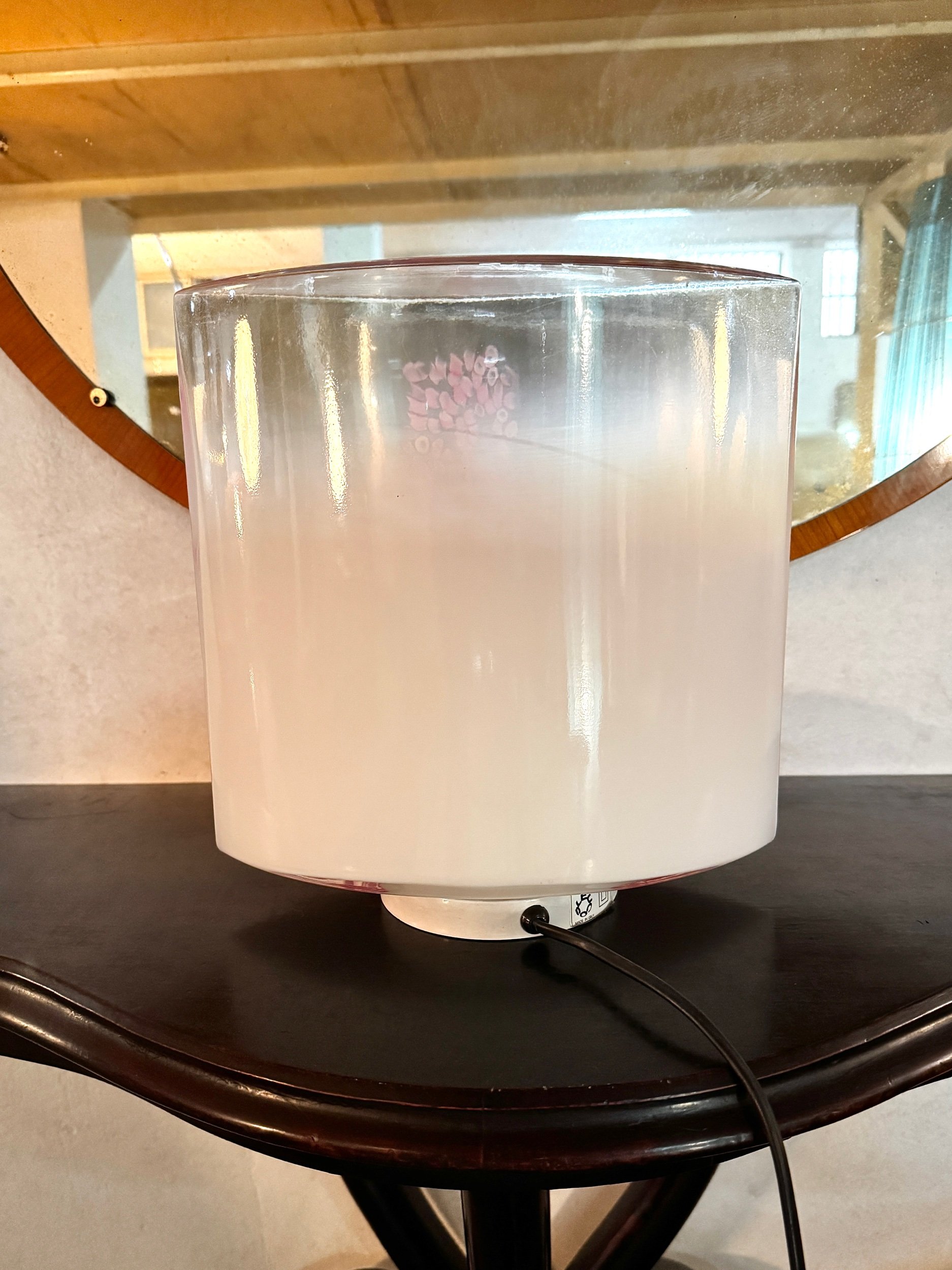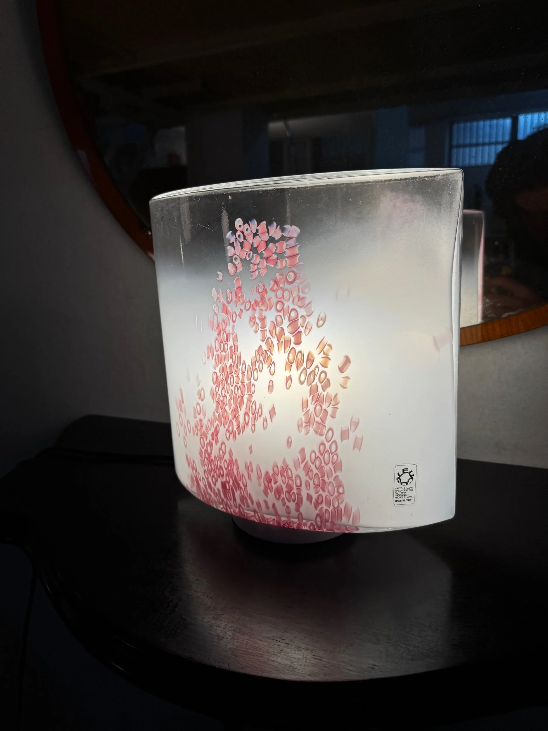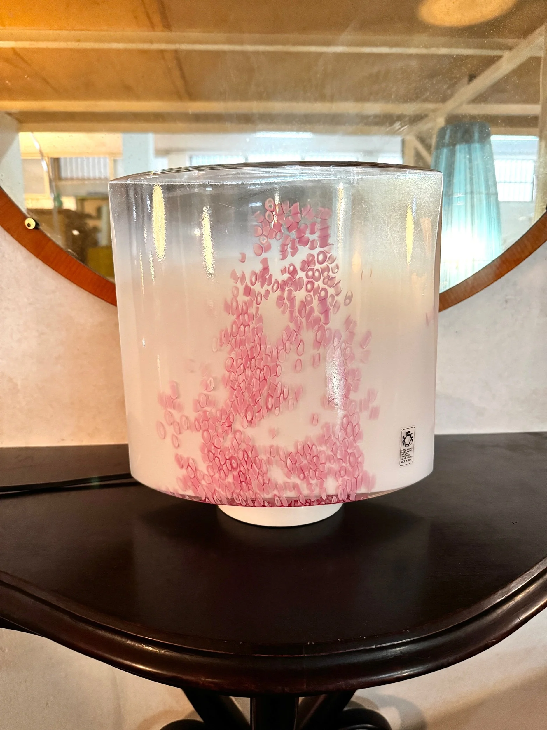 Lampada con etichetta originale Leucos, design in vetro soffiato di Murano con decoro in murrine rosa inglobate nella massa vitrea.