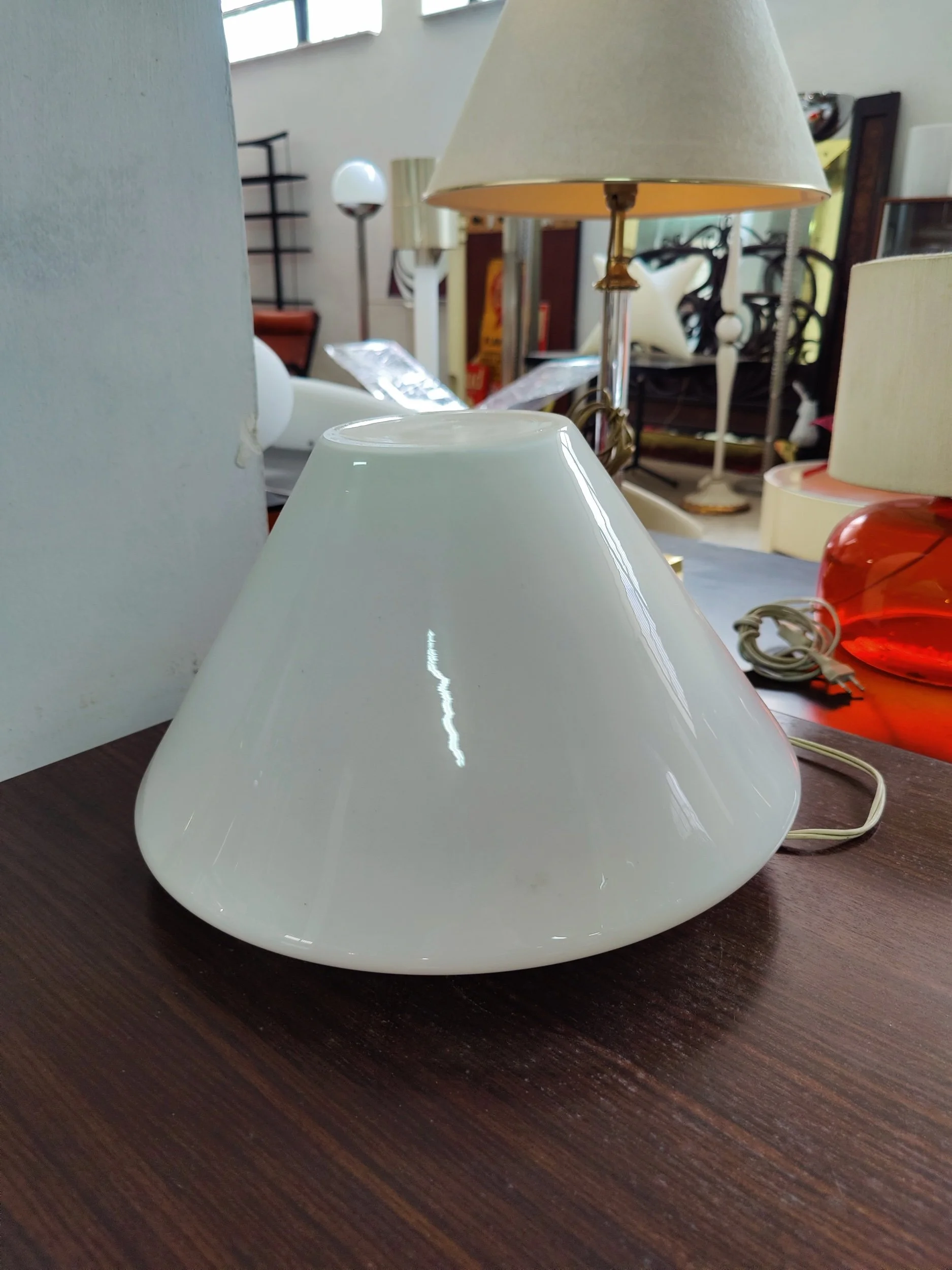 Accesa, le fasce opaline diffondono luce calda e uniforme creando un effetto a strati. Funziona su un comodino, una mensola o un piano d’appoggio in un interno contemporaneo o vintage.